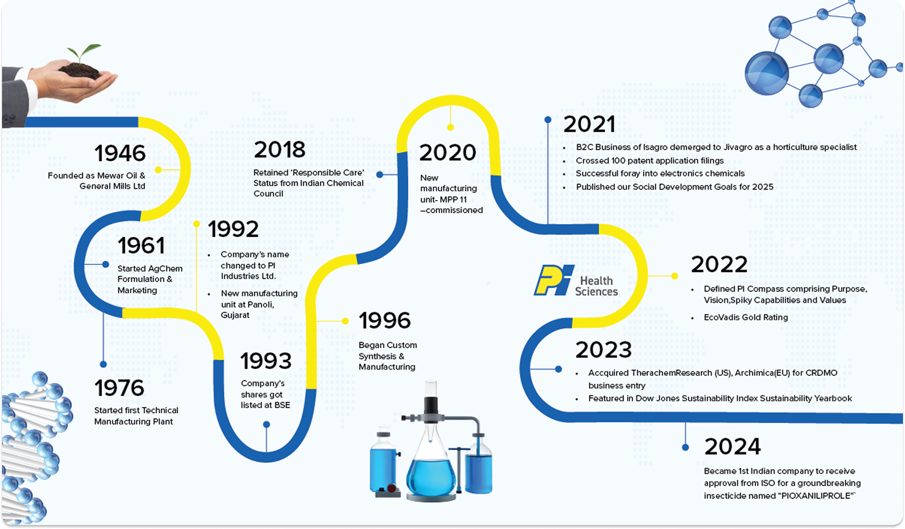 Founded in 1946, PI has a rich legacy that is anchored around the core belief that ‘Science’ makes the difference. At PI, we believe that Science inspires, that Science catalyzes relationships, and that Science makes chemistry happen. Over the past 80 years, we have leveraged Science to make a difference in Life Sciences- whether it is plant health, animal health, environmental health, and more recently, human health.