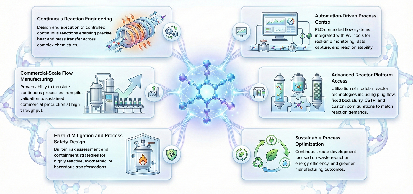 We follow a structured approach that combines reactive hazard assessment, process modeling, automated pilot studies, and real-time data integration. This ensures smooth conversion from batch processes to continuous flow systems without compromising quality, regulatory compliance, or supply reliability.